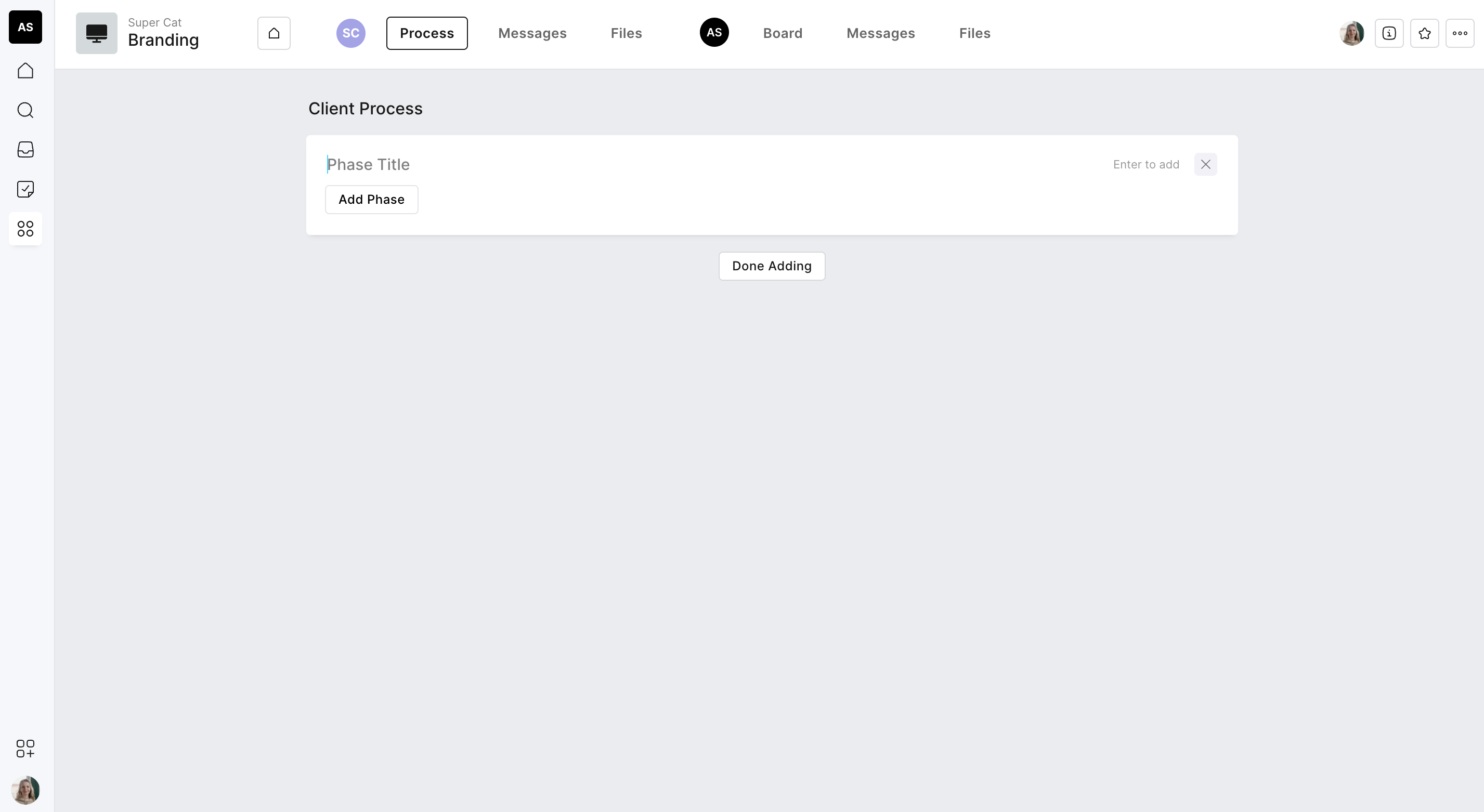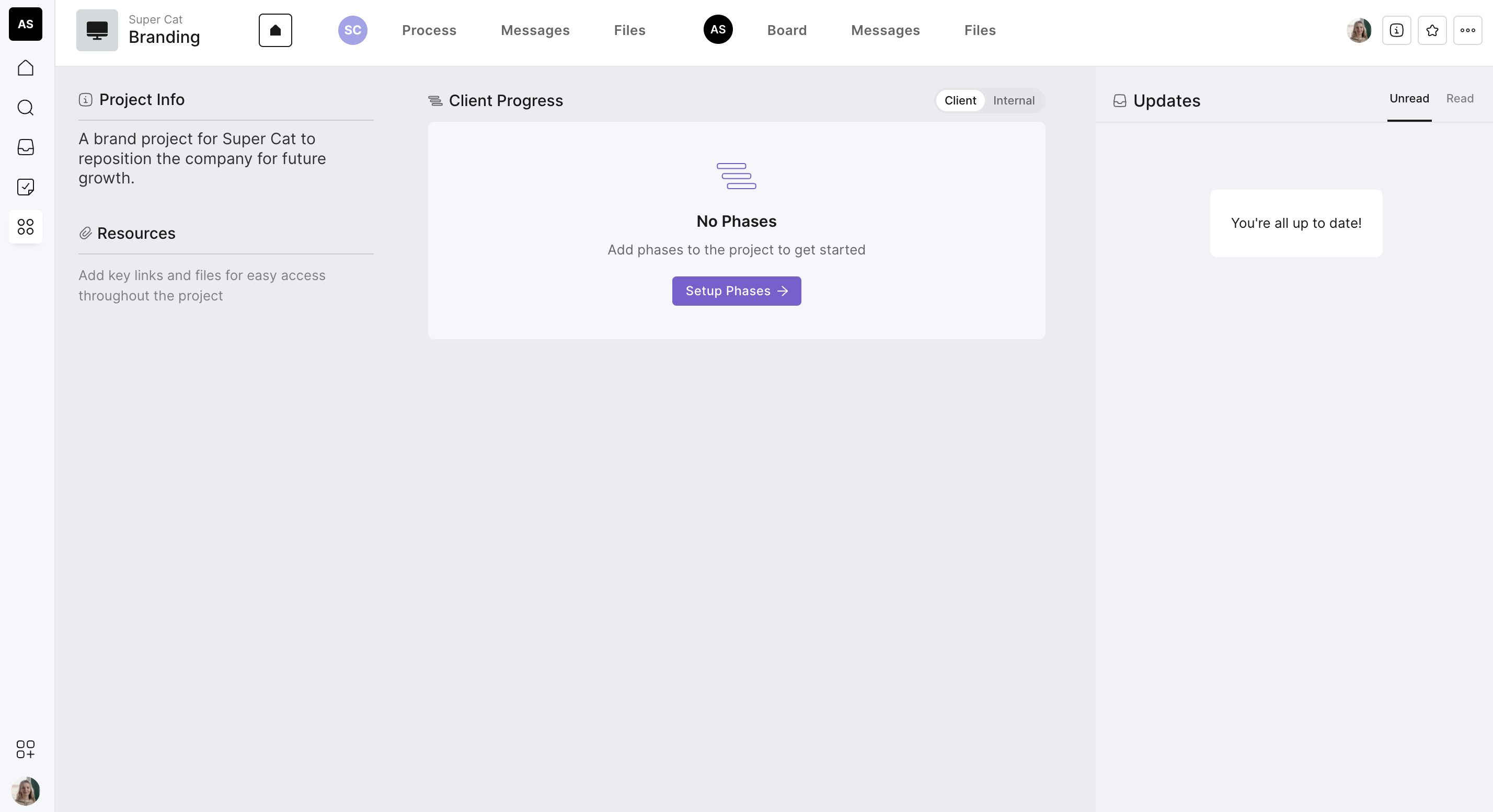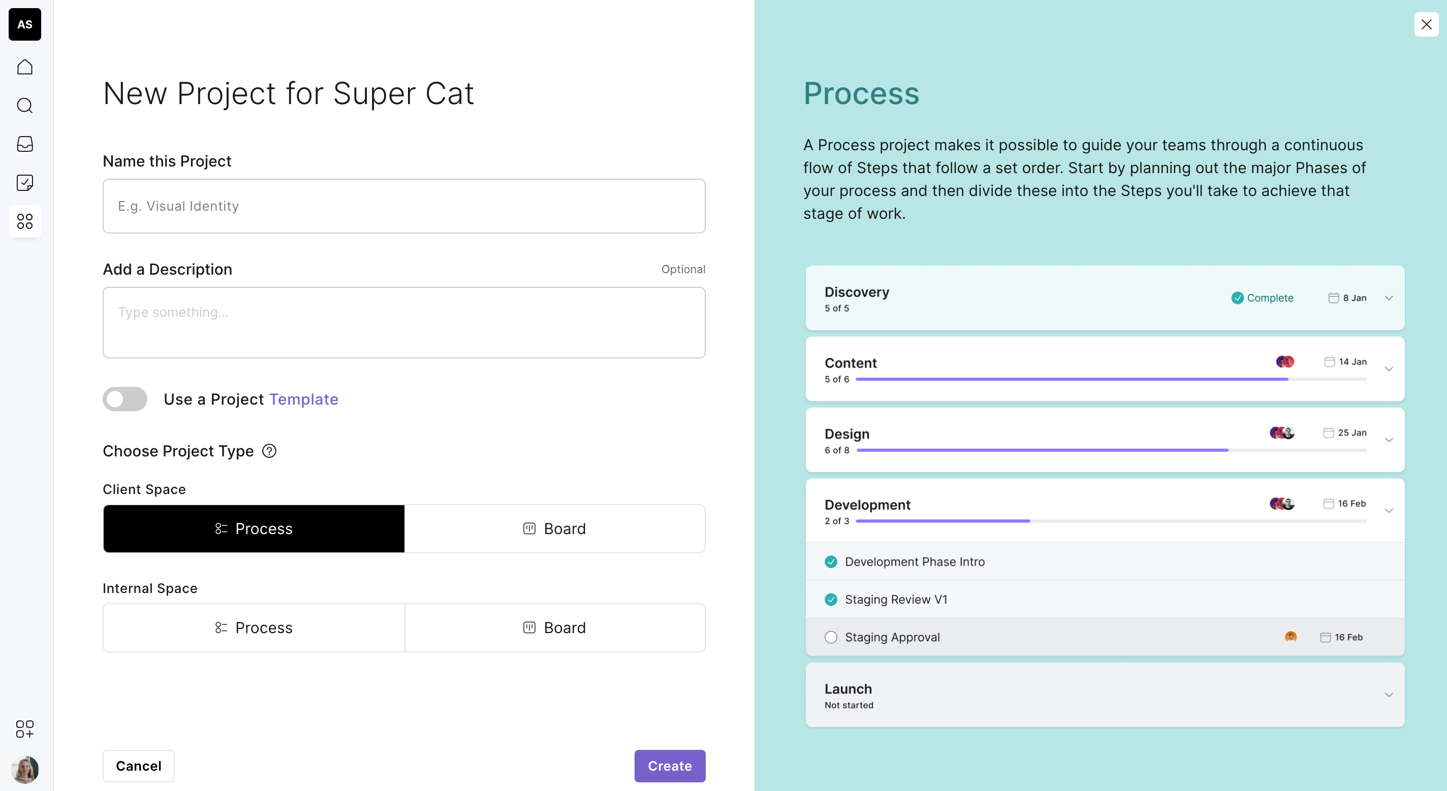 You will notice during the setup process that you can add an internal space. This gives you the ability to add either a task board or a process within the project just for your agency team and is hidden from your client. This enables a few benefits