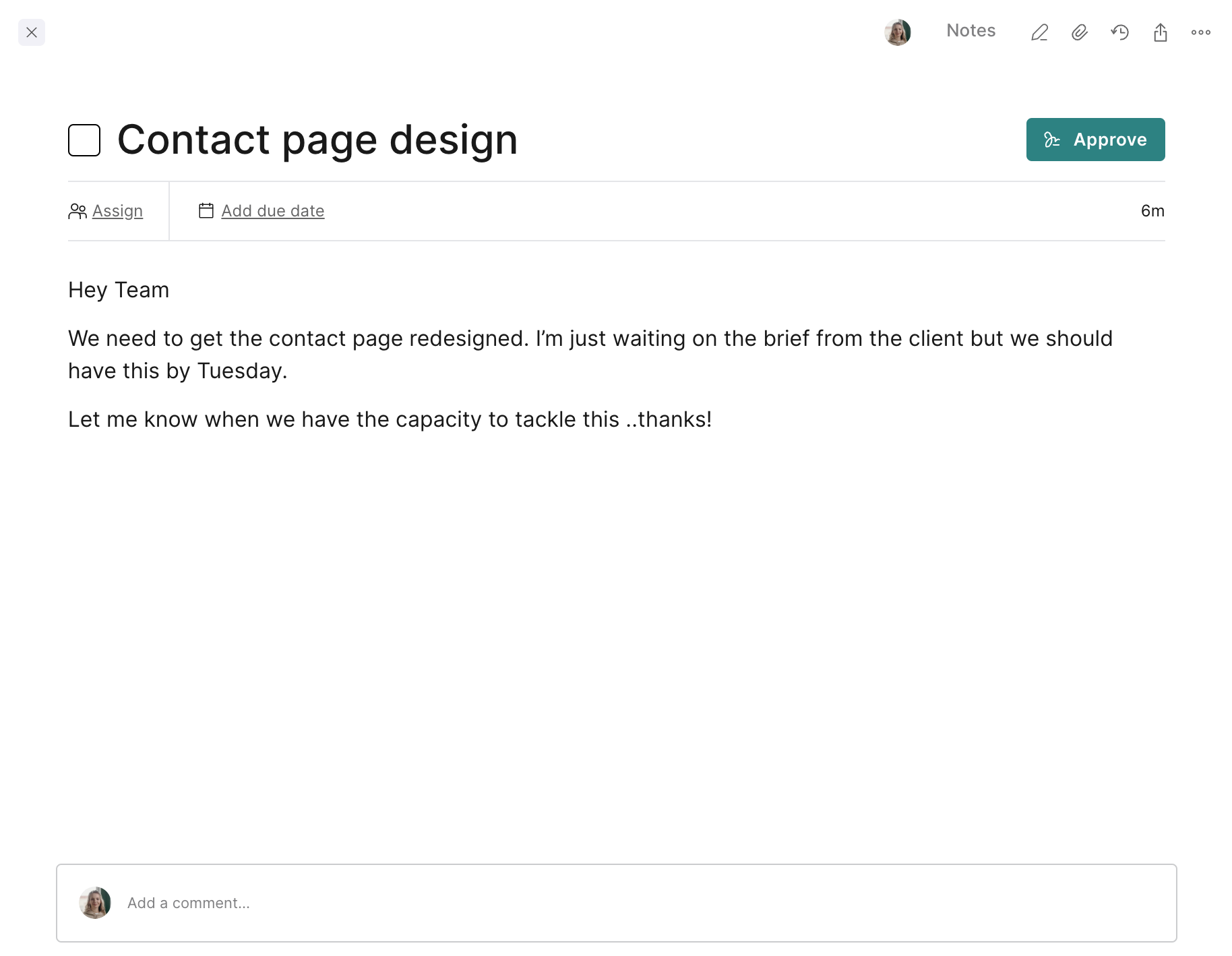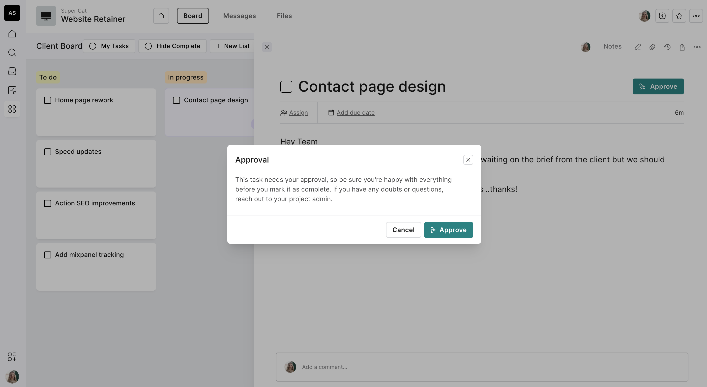 When your task reaches the moment when approval is needed, just ask the client to approve the task by pressing the green approve button
