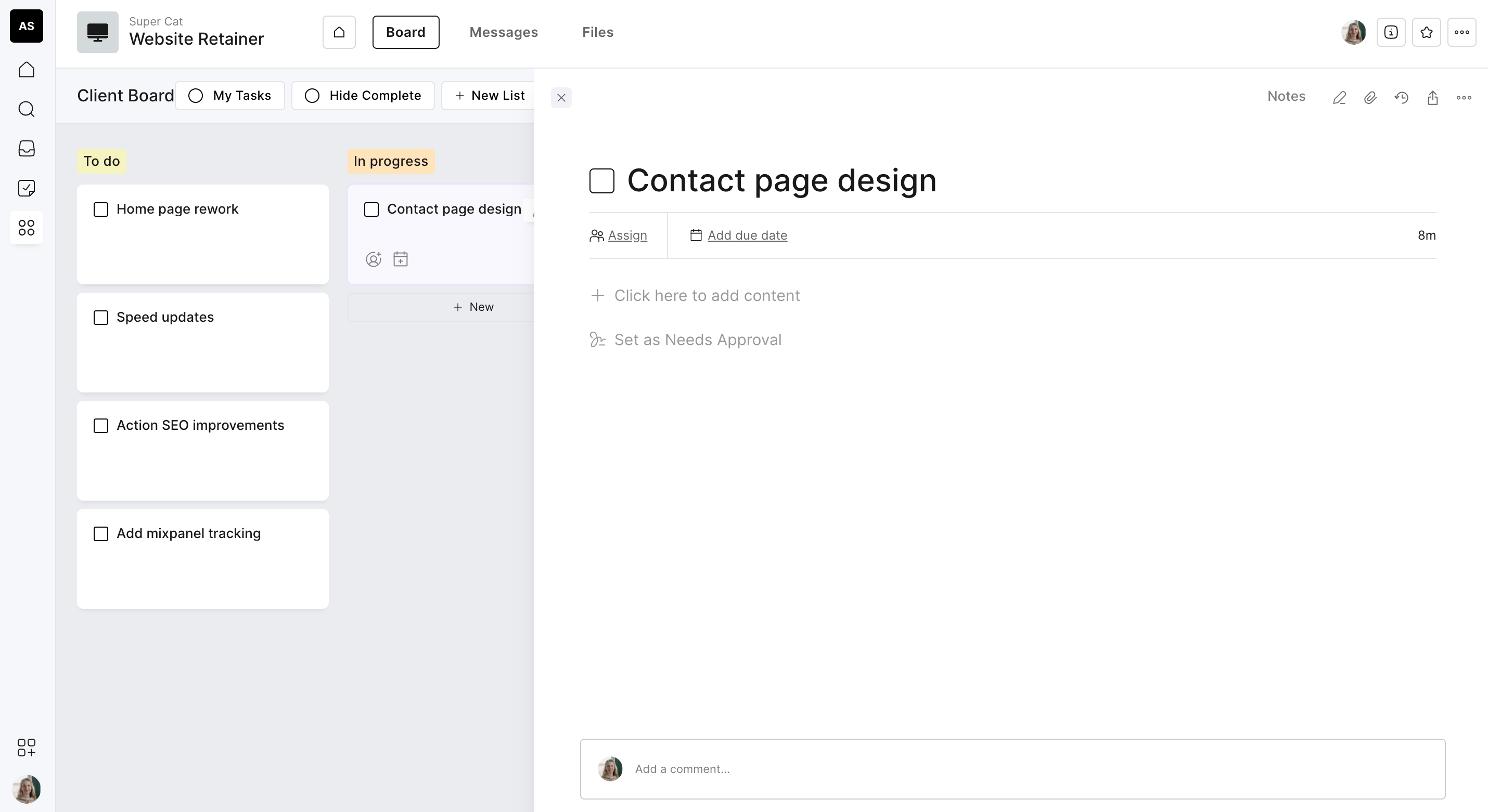 Task boards are perfect for retainer clients or smaller, short projects or one-off tasks. They can also be used on agile-style projects which have more complexity.