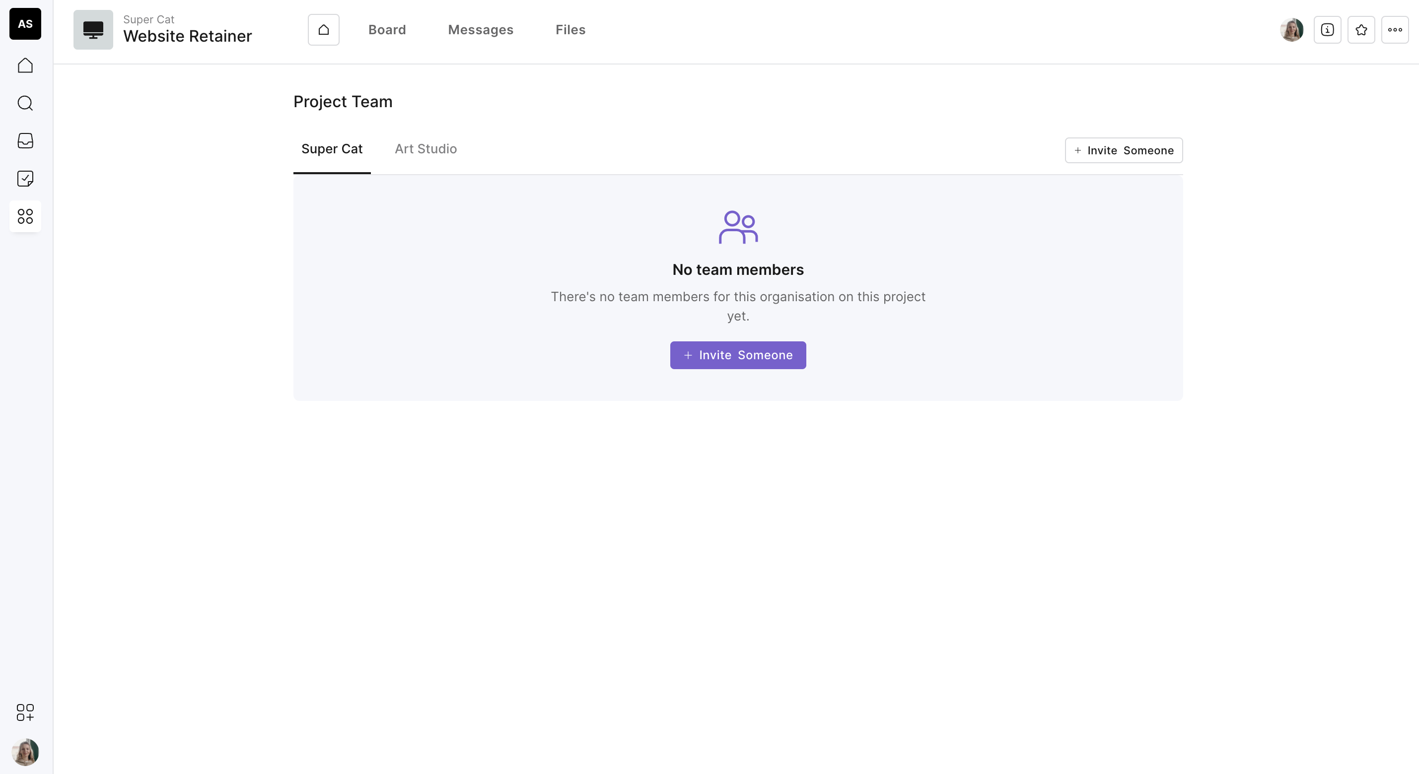 Click on 'Invite someone' — you can do this to add people from your internal team or tab across to the client team to invite clients
