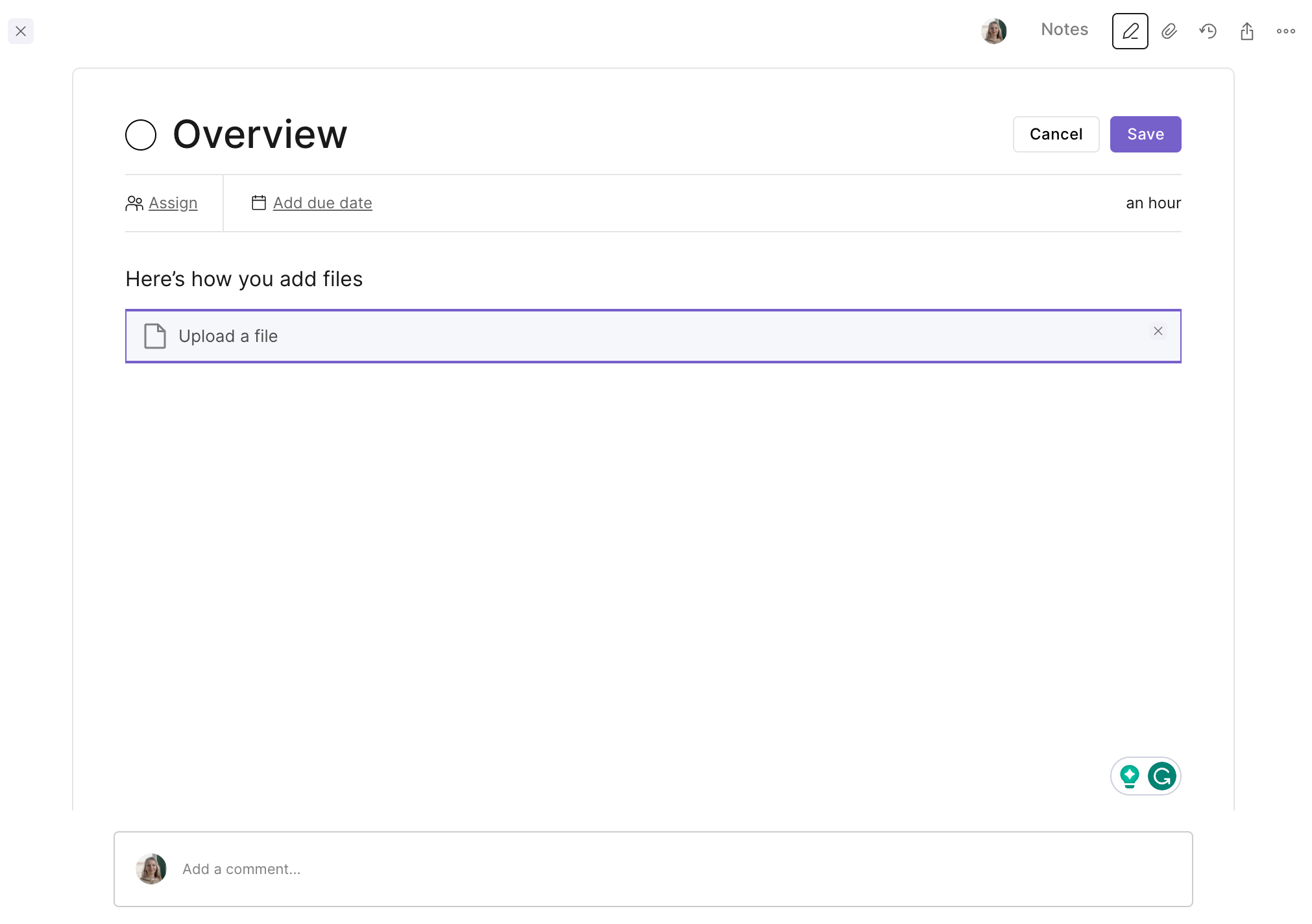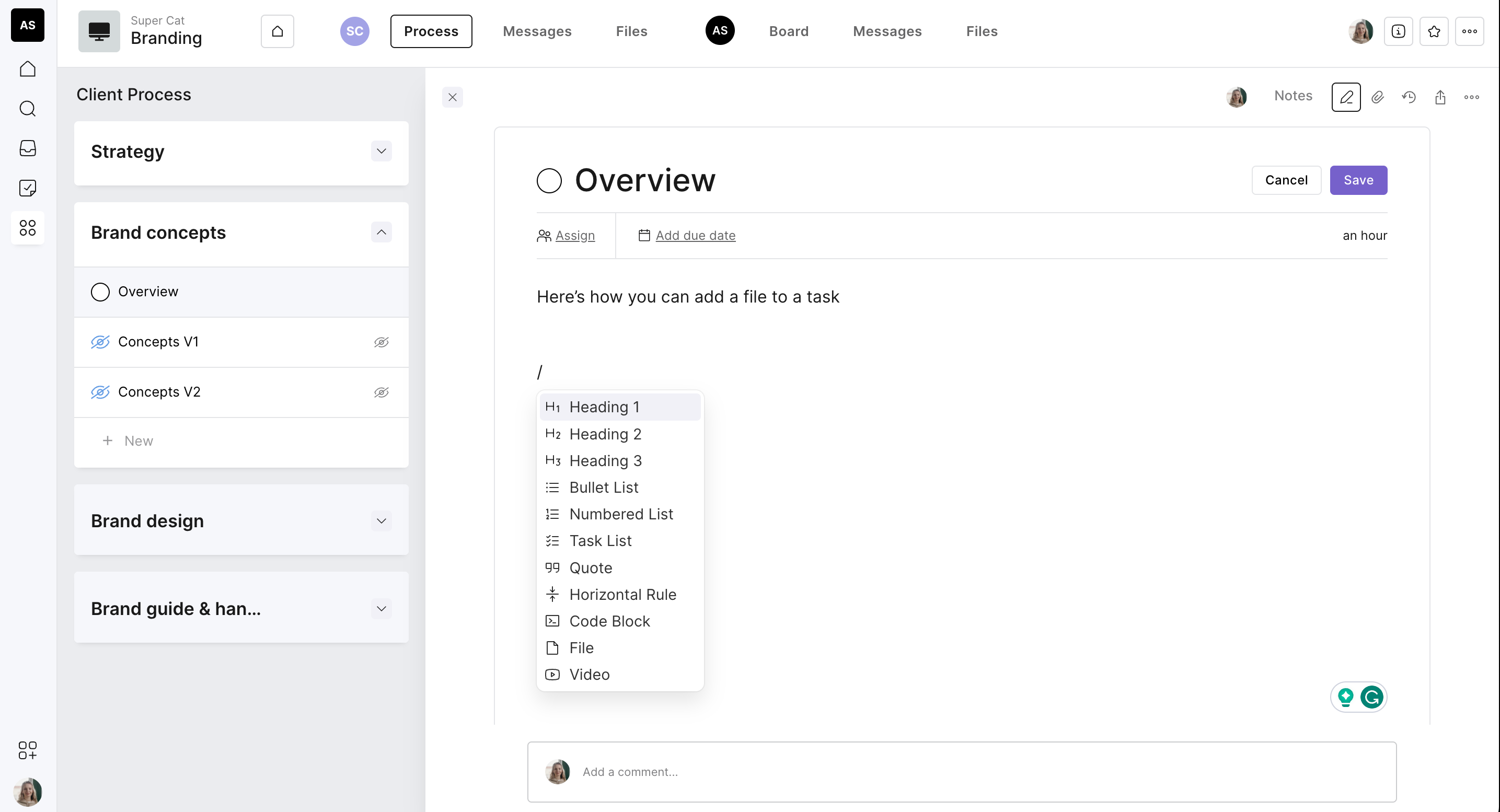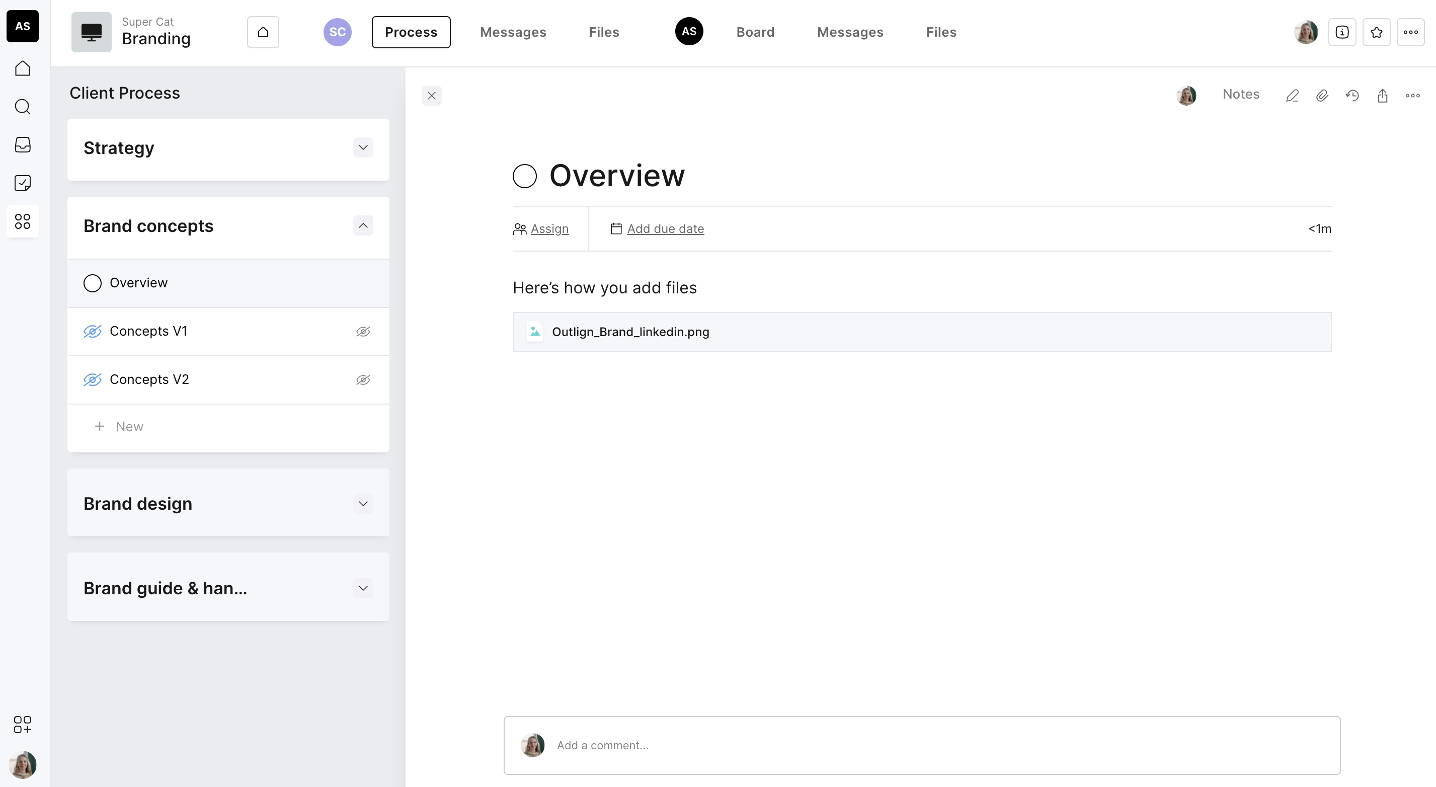 There are three ways to add files to Outlign: You can add files to a task, add files to a discussion or you can add files through the files space