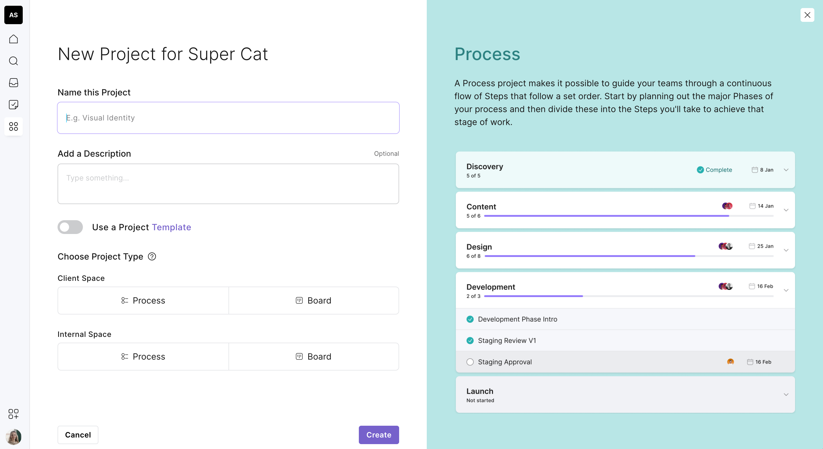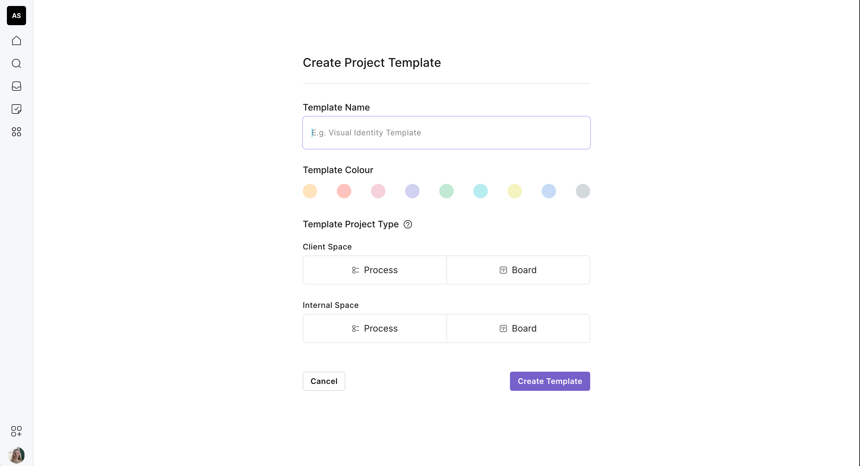 Start by adding the name of your process or task board template, select the template type and hit 'create template'