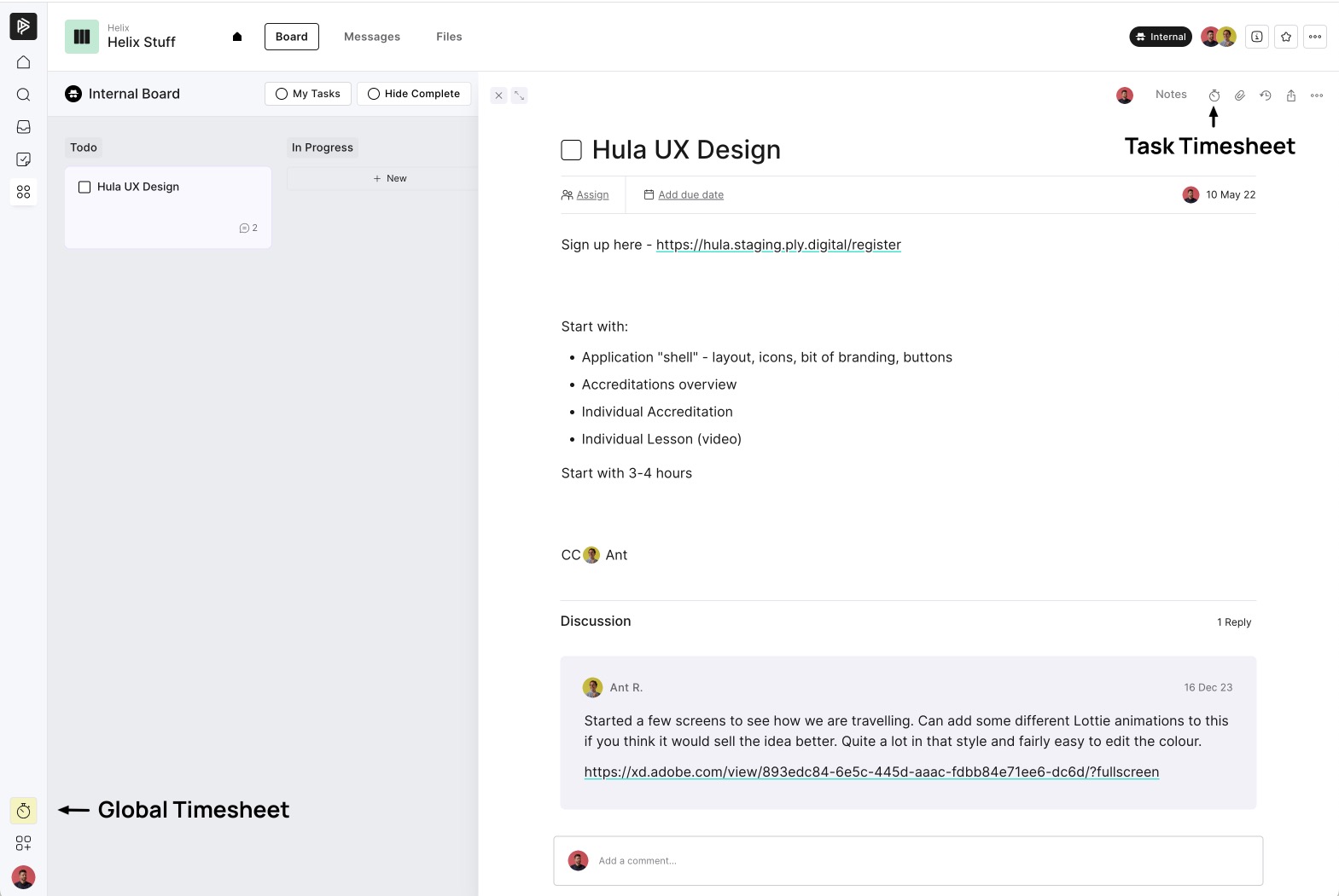 Outlign offers the ability to time tracking and monitor project budgets through Harvest - simple time tracking software that's great for agencies.