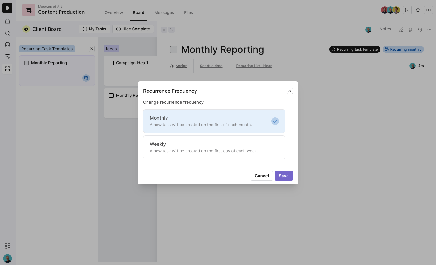 We’re excited to announce the Recurring Tasks feature, designed to simplify and streamline repetitive workflows. This feature is ideal for agencies managing tasks that restart regularly, such as monthly reporting, weekly status updates, or routine client deliverables.