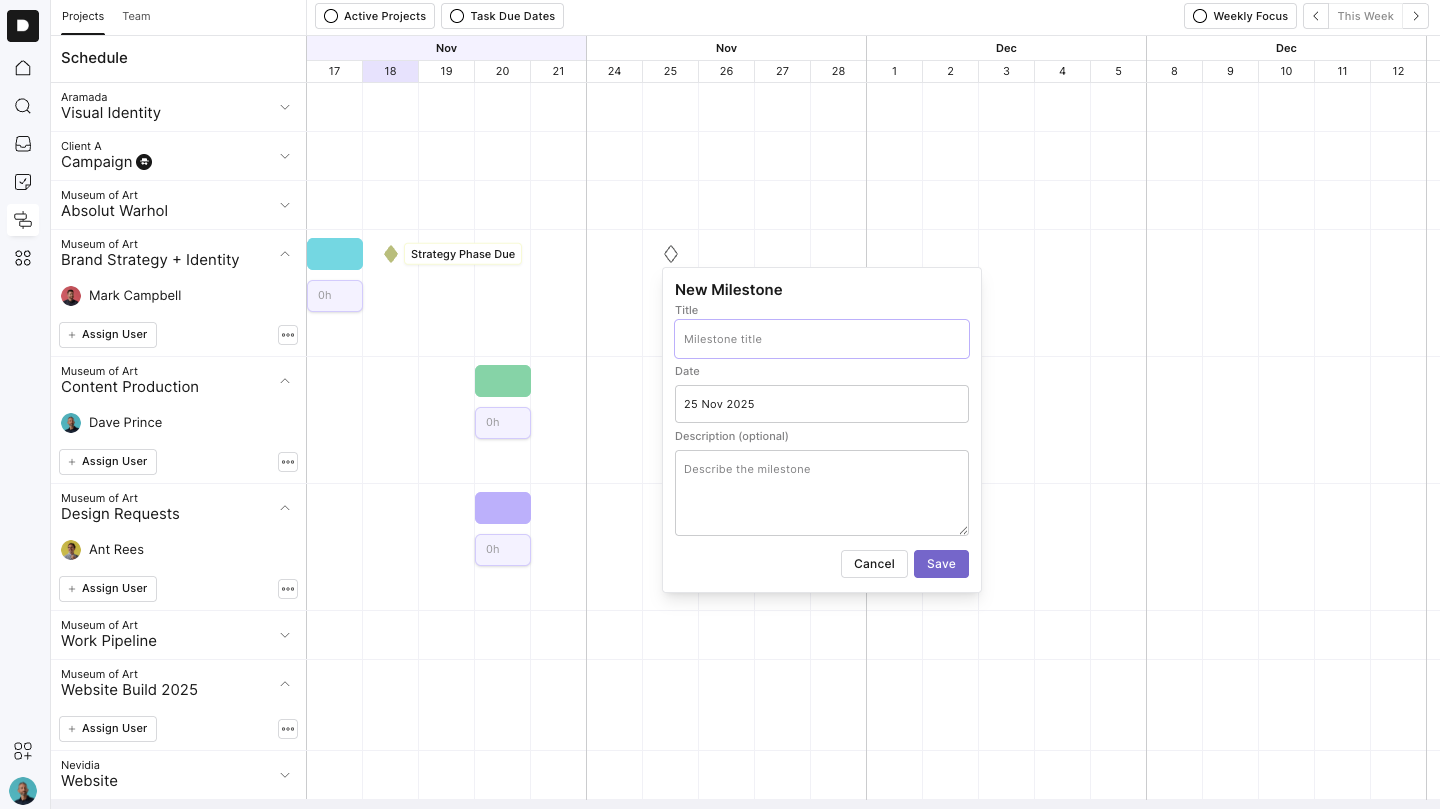 On the left-hand side, you’ll see a list of all your active projects, grouped by client name. These are pulled automatically from your Project workspace, so there’s no need to manually add them.