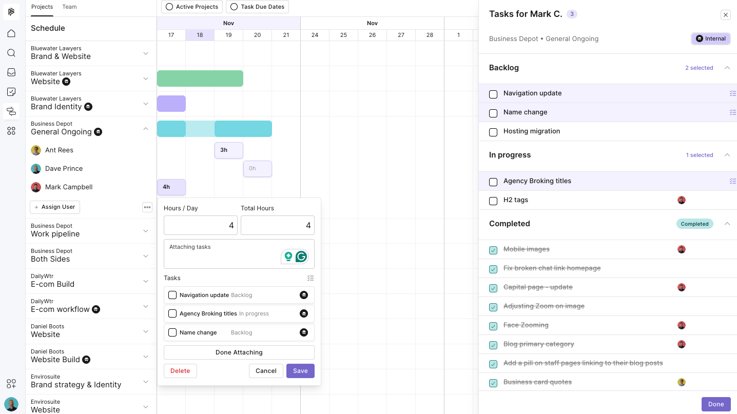 Once you’ve selected your hours and added any notes, it’s time to attach tasks. This step links the time you’ve just planned to real project work, keeping everything organised and accountable.