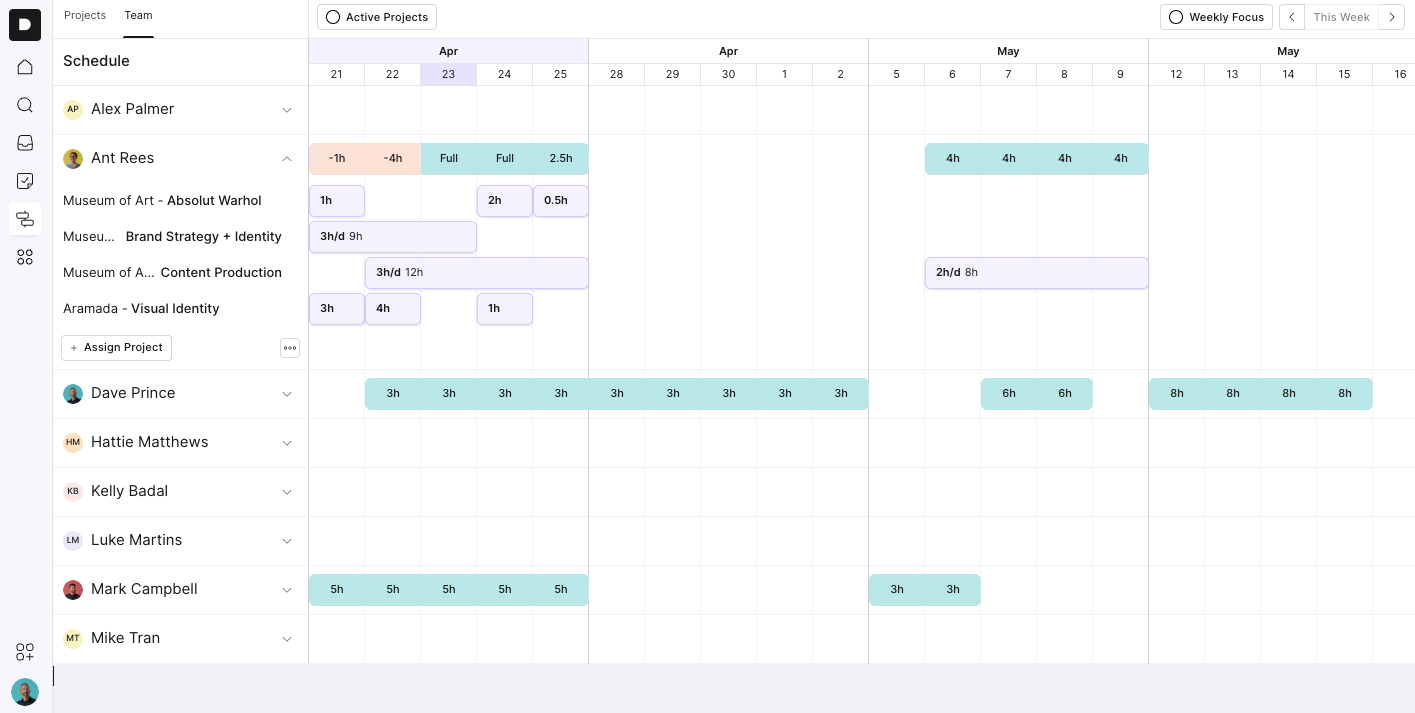 If someone’s overbooked, their hours will highlight in red so you can rebalance the load before it becomes a problem