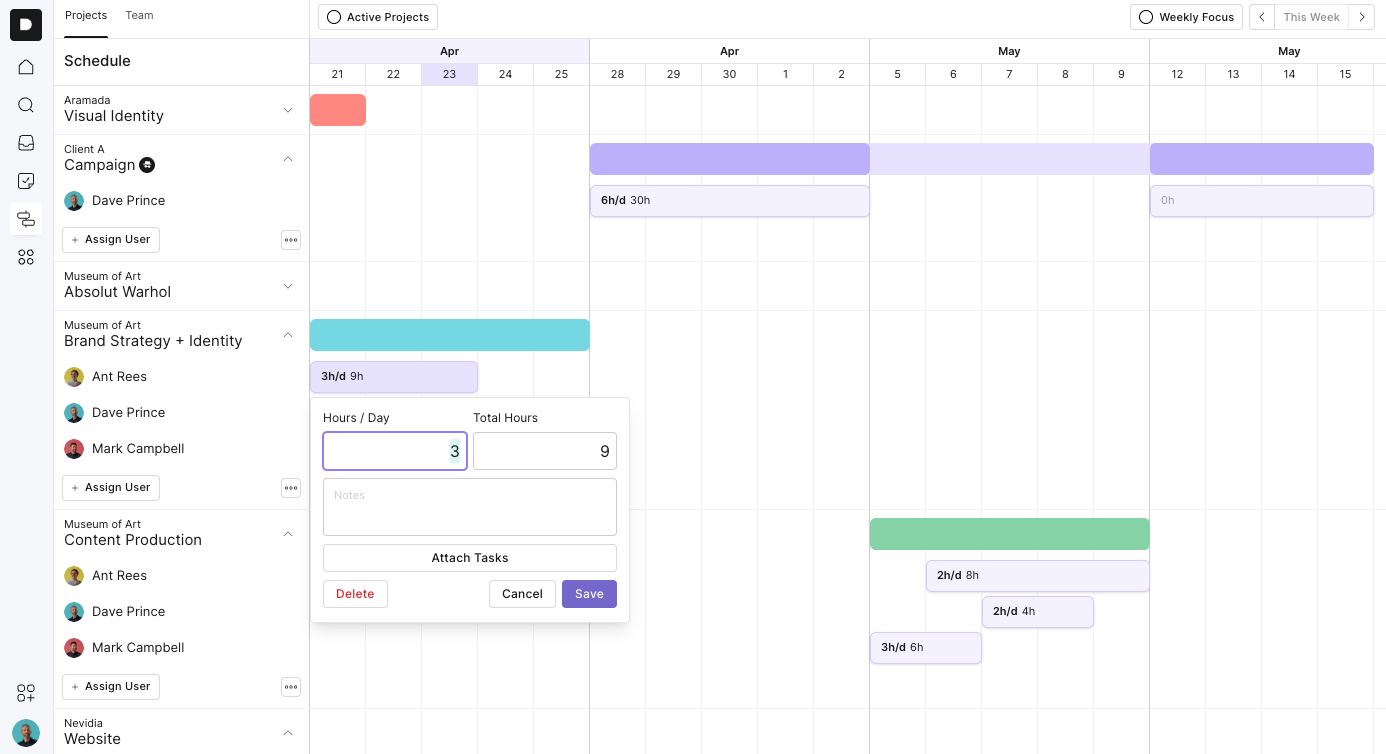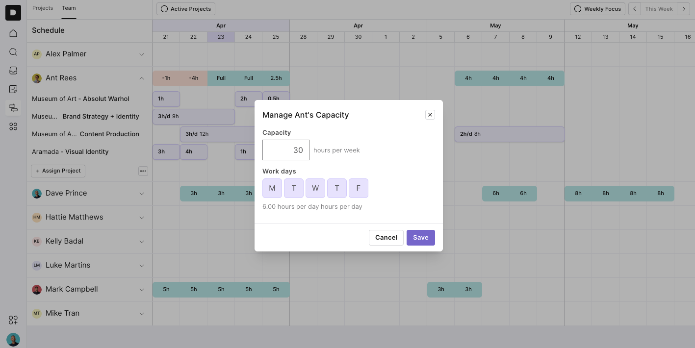 Adjust hours right from the team view and it syncs with the project schedule