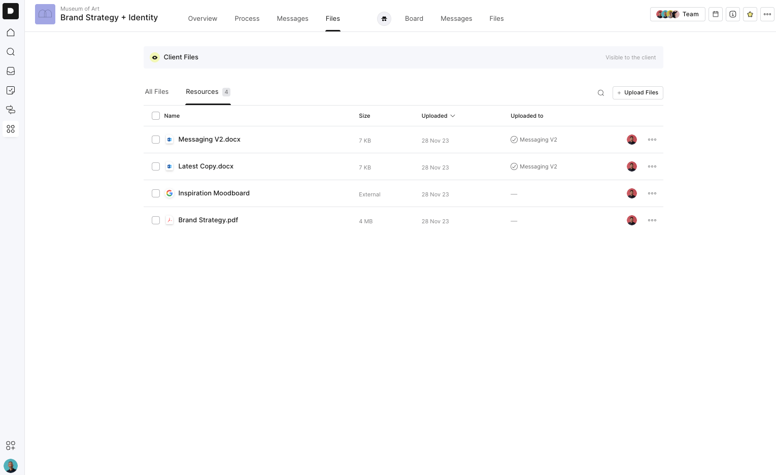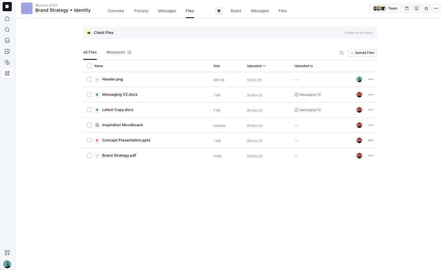 Project Files keeps every asset neatly organised so you can quickly search, filter, and trace files as your project grows, saving time and reducing the back-and-forth that usually comes with long-running client work.