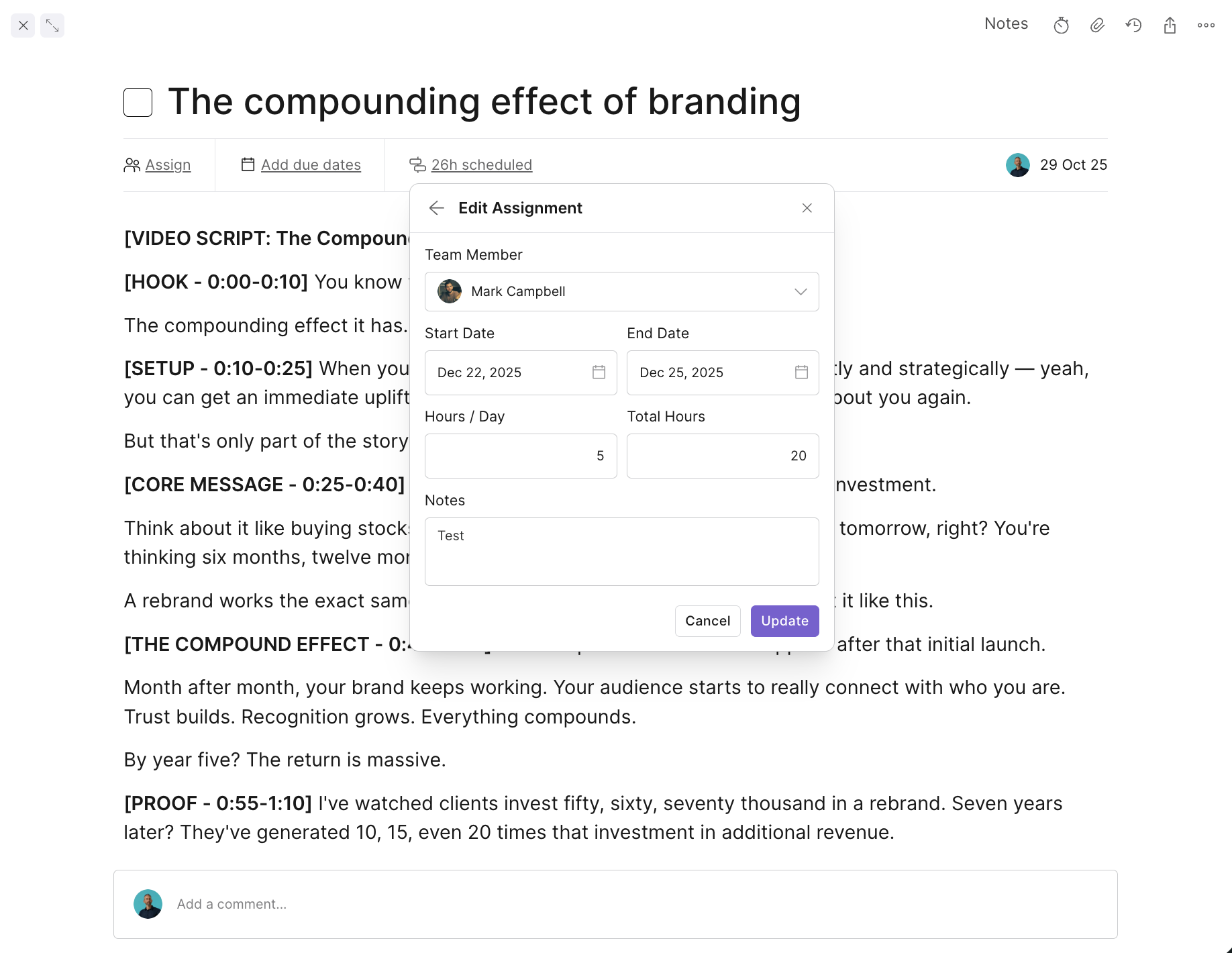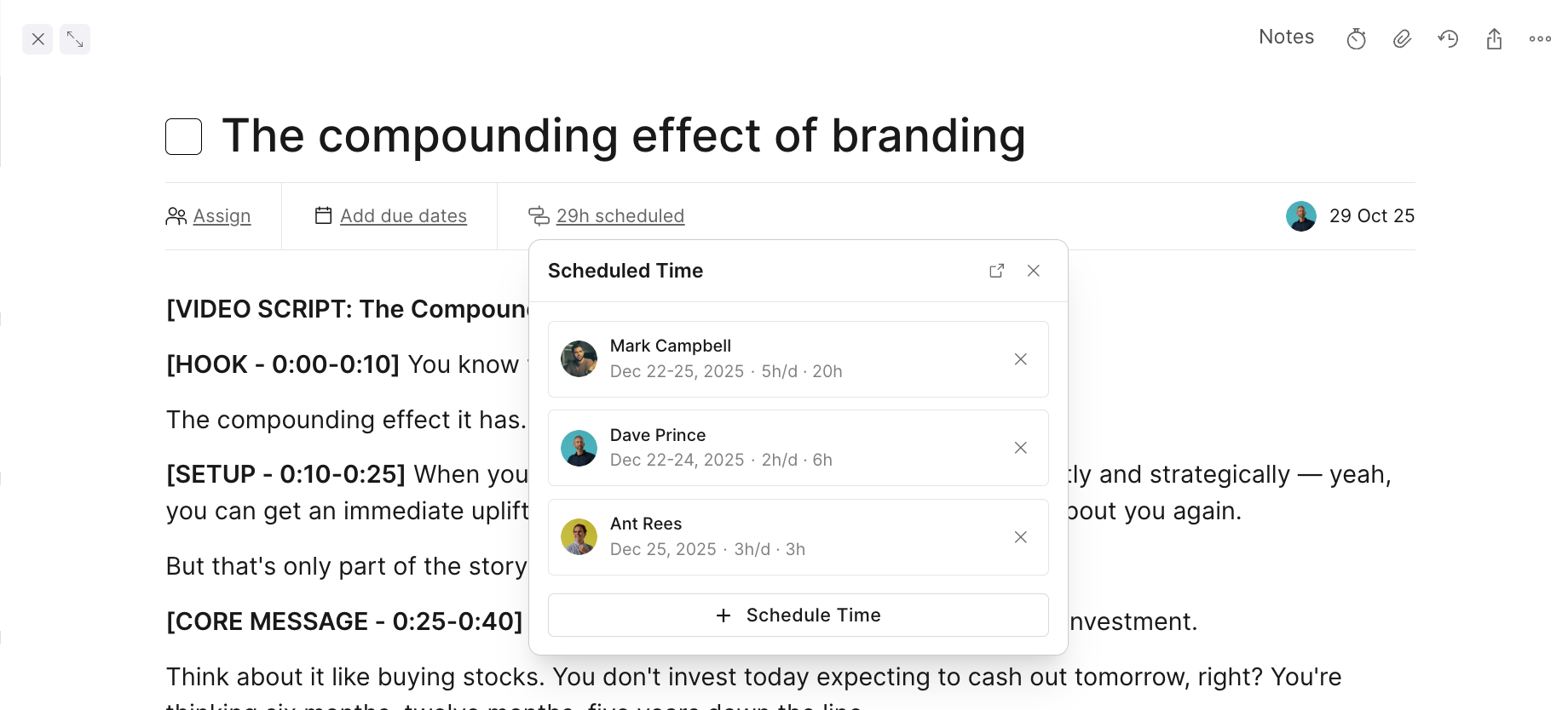 When you schedule multiple tasks or steps within the same project for one team member, Outlign automatically groups them together in the Schedule view.