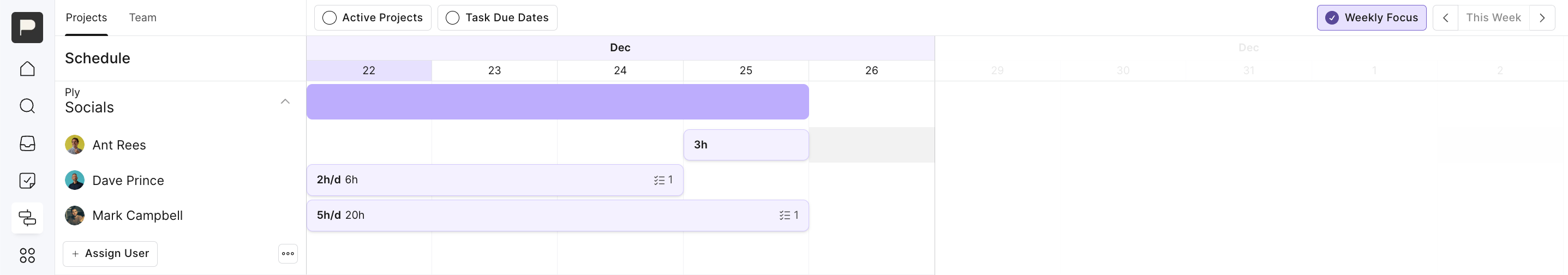 In the Schedule view, Outlign will collate these tasks together, pulling all related tasks from that project into a single grouped view. This gives you a clear picture of how that person’s time is allocated across the project, without clutter or duplication.