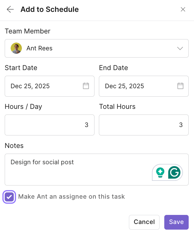 Assign the task to the team member if needed (so that they are assigned at the task level and in the schedule)